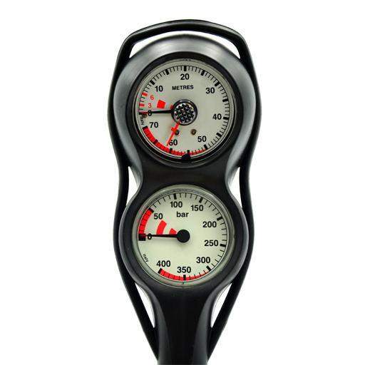 Housed in a tough rubber boot with a streamlined profile, the console features a high-visibility submersible pressure gauge (SPG) and a clearly marked depth gauge, each with luminescent dials for easy reading in low light or murky conditions. The SPG reads up to 360 bar (or 5000 PSI), while the depth gauge offers accurate readings with a maximum depth indicator for added safety.